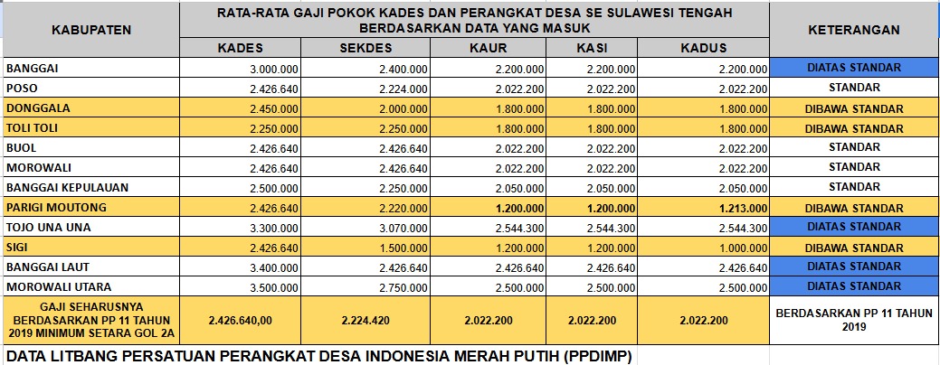 “Kami telah melakukan pendataan besaran gaji pokok perangkat desa se-Sulawesi Tengah dan menemukan bahwa tinggal empat kabupaten yang masih belum memenuhi standar gaji pokok minimum sebesar Rp2.022.000, sebagaimana diamanatkan dalam PP Nomor 11 Tahun 2019,” jelas Zulkifli sambil menunjukkan data Rekapitulasi Gaji Pokok Perangkat Desa se-Sulawesi Tengah.