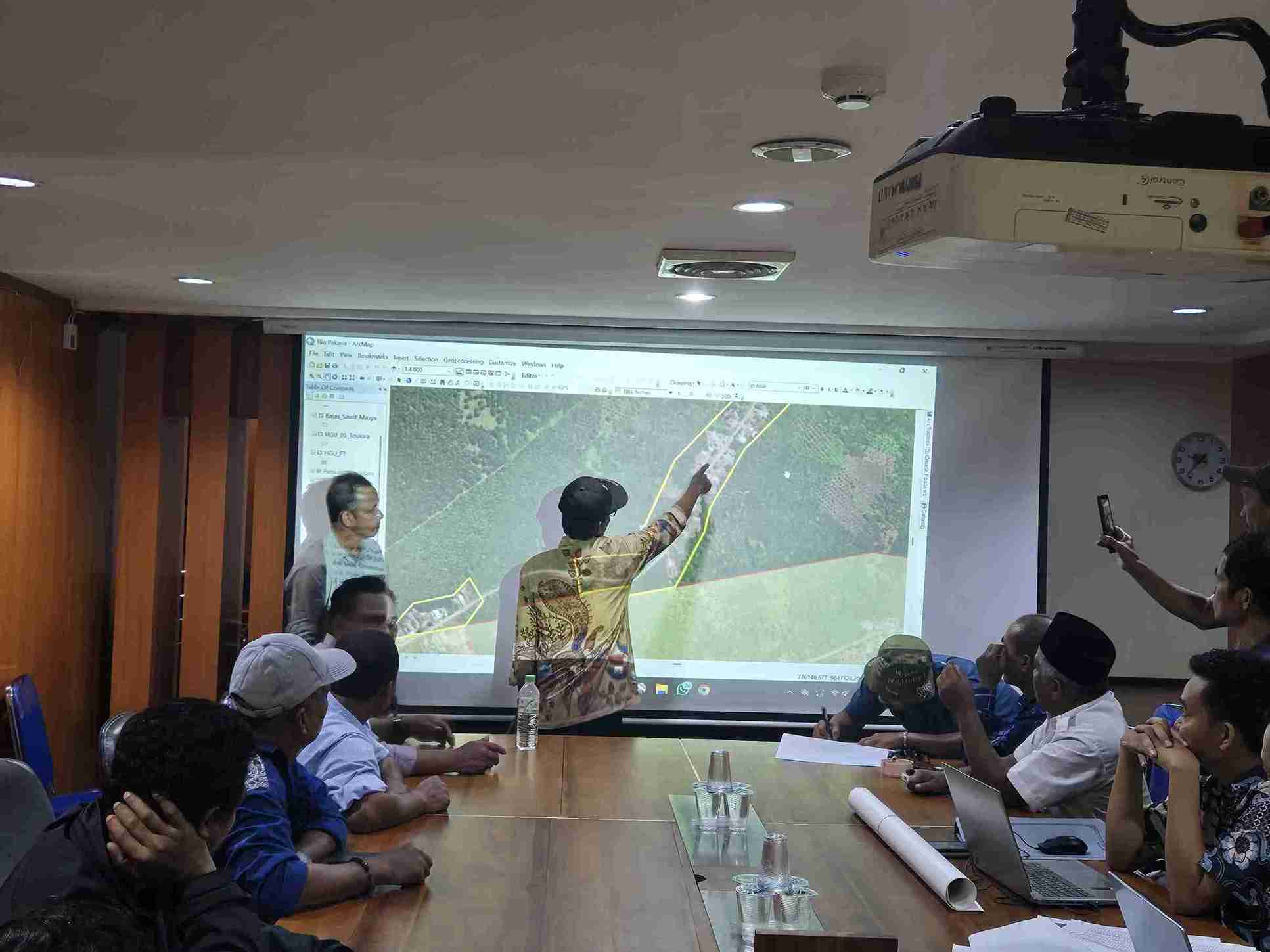 Anggota Satgas PKA Sulteng bersama perwakilan warga dan instansi teknis meninjau data spasial pada layar proyektor saat sinkronisasi peta transmigrasi dan kawasan HGU di Palu, Selasa (28/10/25). (Foto: Istimewa)