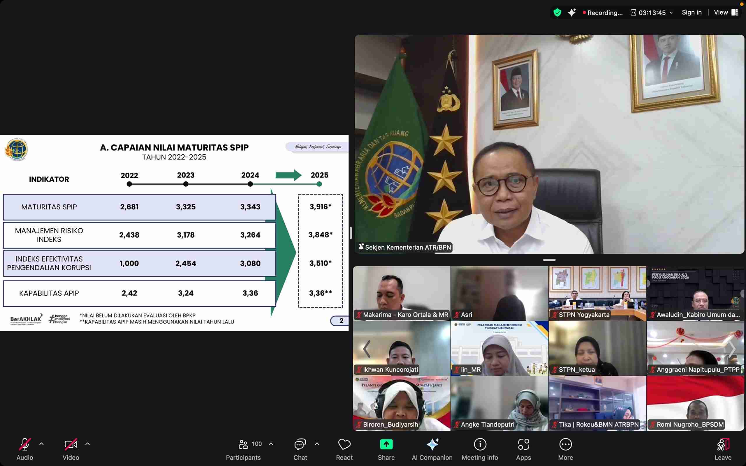 Adapun hasil penilaian mandiri tahun 2025 oleh Inspektorat Jenderal Kementerian ATR/BPN mencatat empat indikator utama, yakni Maturitas SPIP 3,916; Manajemen Risiko Indeks 3,848; Indeks Efektivitas Pengendalian Korupsi 3,080; dan Kapabilitas APIP 3,36. Hasil ini akan dievaluasi lebih lanjut oleh Badan Pengawasan Keuangan dan Pembangunan (BPKP) sebagai penilai eksternal.